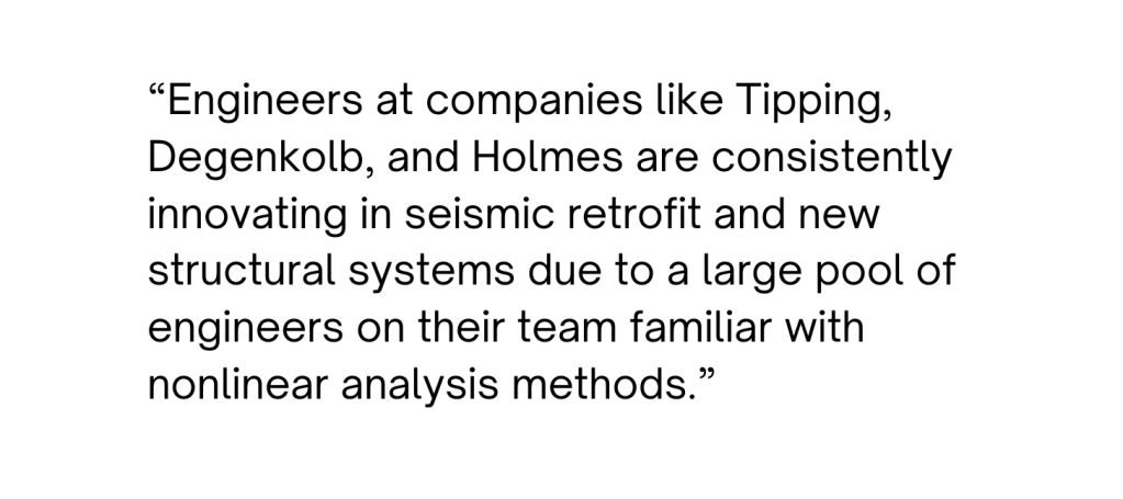 Does it mean some engineering companies with expertise in performance-based design and nonlinear analysis could lose opportunities due to increased competition? Maybe for simple projects. But, I think this could lead to more innovations by these industry leaders. Almost all structural engineers in the world use the same elastic design method but Architects and developers still prefer a handful of names like Arup, WSP, SOM for unique buildings. Engineers at companies like Tipping, Degenkolb, and Holmes are consistently innovating in seismic retrofit and new structural systems due to a large pool of engineers on their team familiar with nonlinear analysis methods. Moreover, countries around the world require their own unique structural solutions utilizing local materials, focused on serving the local communities. Even if they don’t use it to design structures regularly, they should be able to help their building design codes evolve with the help of their discussions.