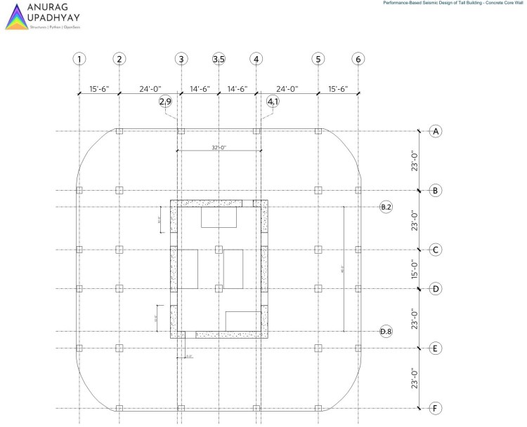 Figure 2 shows a typical structural floor plan of the building. The elevator core consists of planer and L-shaped sections connected by 30-in.-deep coupling beams over doorways that provide access to elevators and stairs. The wall thickness changes at levels 13, and 31. The core has 32-in. thick walls from foundation to level 13, 24-in. thick walls, from level 13 to level 31, and 21-in. thick above level 31. The core wall system is designed using a concrete strength of 8 ksi (28-day) and 60 ksi rebar. Coupling beam reinforcement details are presented in Figure 3 for each direction.